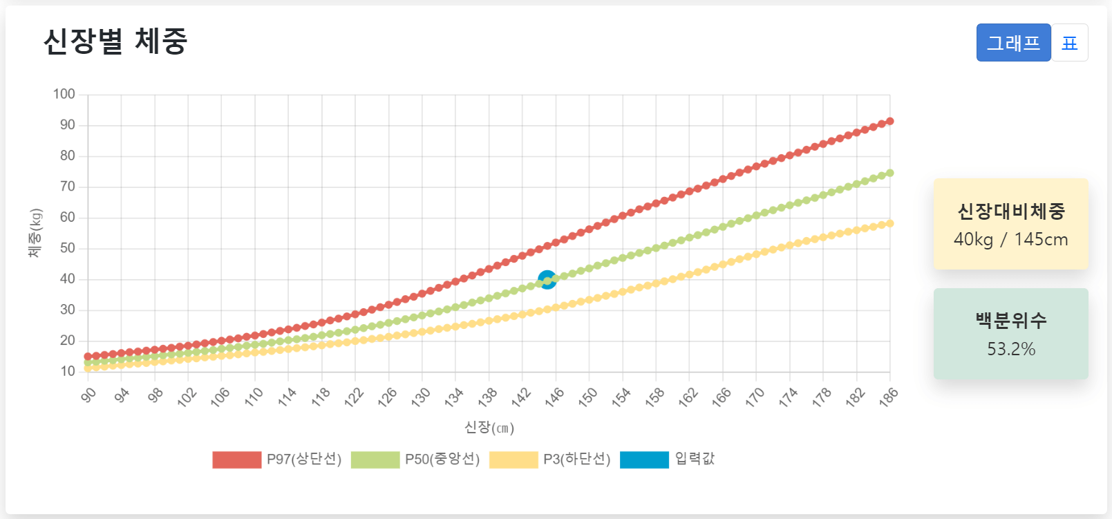 위와 같은 예시로 남자, 10세(120개월), 신장 145cm, 체중 40kg을 입력해서 측정을 해봤습니다.
