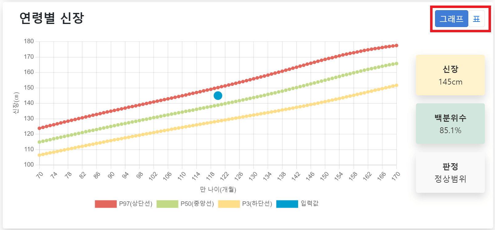 입력한 정보는 파란색 점으로 표에 표시되어 🟧P5(5%), 🟩P50(50%), 🟥P95(95%) 색상별로 백분위로 표시가 됩니다. 빨간색 95%는 상위 5%에 속하게 되는 것입니다.