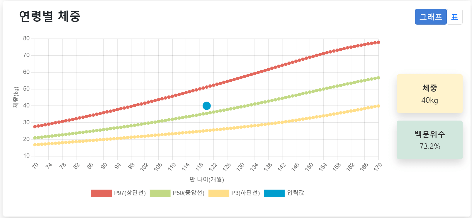 모바일에서 간편하게 사용하실 수 있지만 질병관리청에서 제공하는 측정계산기나 아기성장발달계산기에서 처럼 자세한 사항은 나오지 않습니다.